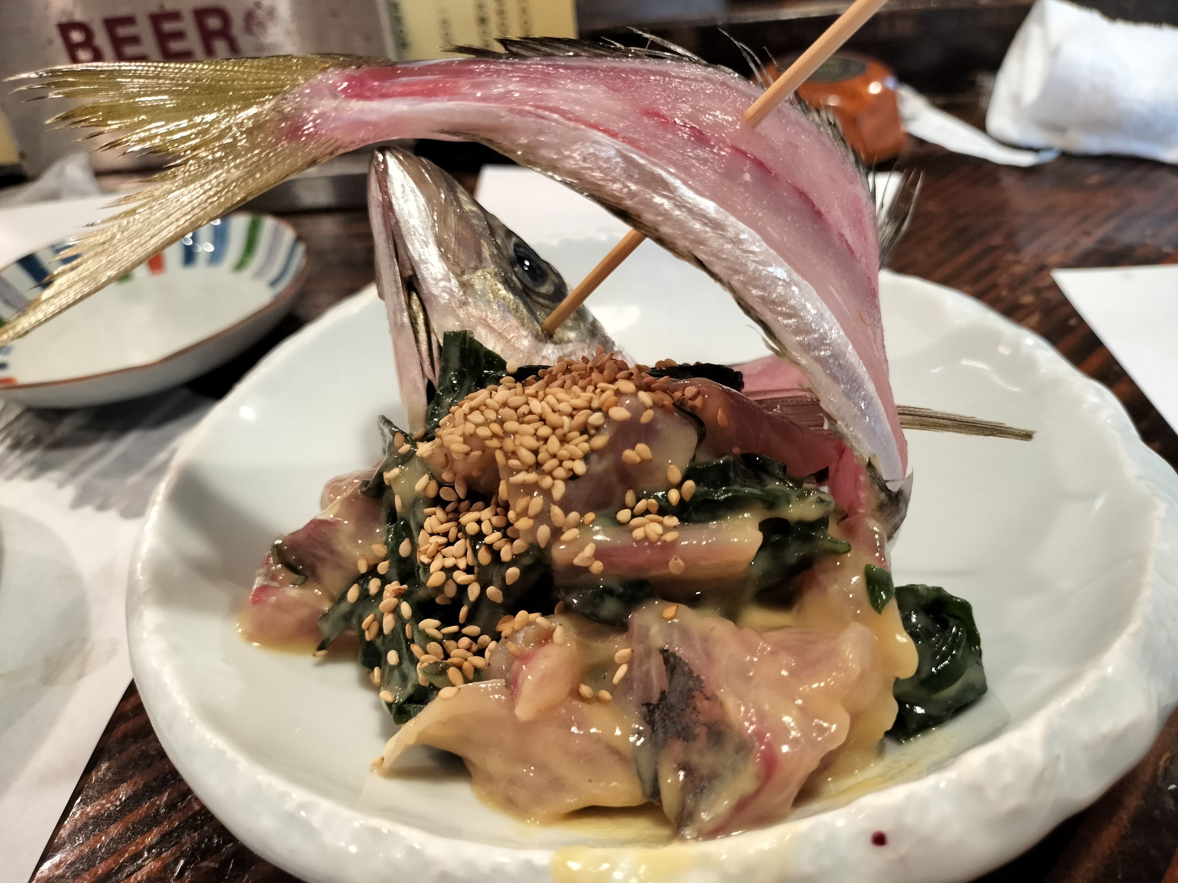 次にいただいたのは「アジのなめろう」。骨ごと大胆に盛り付けられた姿に思わず驚きました。味噌とゴマの香ばしさが加わることで、青魚特有のクセがまろやかになり、濃厚でいて食べやすい味わいです。